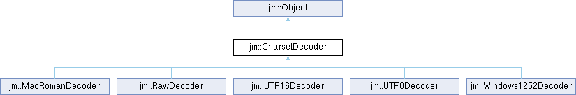 Implemented in jm::RawDecoder, jm::UTF8Decoder, jm::UTF16Decoder, jm::Windows1252Decoder, and jm::MacRomanDecoder.