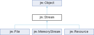 Implemented in jm::MemoryStream, jm::Resource, and jm::File.